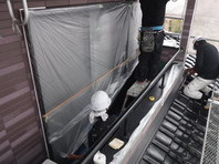 塗装工程として、高圧洗浄後に非塗装面(サッシ、ドア、土間等)汚さないようにビニール系の資材で覆います。