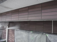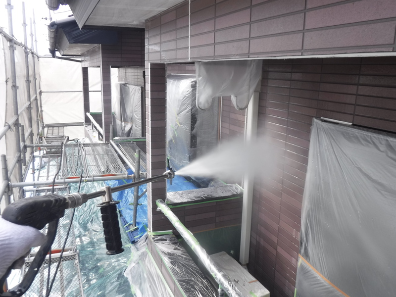 塗装する前に、高圧洗浄機でチョーキング(塗料が劣化して色成分の顔料がチョーク(白墨)のような粉状になる現象)・苔・藻・等を綺麗に落とします。 これを怠ると、どんなに良い塗料を使っても剥離や変色といった塗料の劣化を早める原因になります。 外壁や屋根の劣化・破損がひどい場合には高圧洗浄の前に補修をする事があります。
