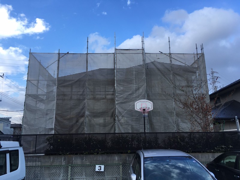 足場組立完了後、写真のようにメッシュシートで覆います。