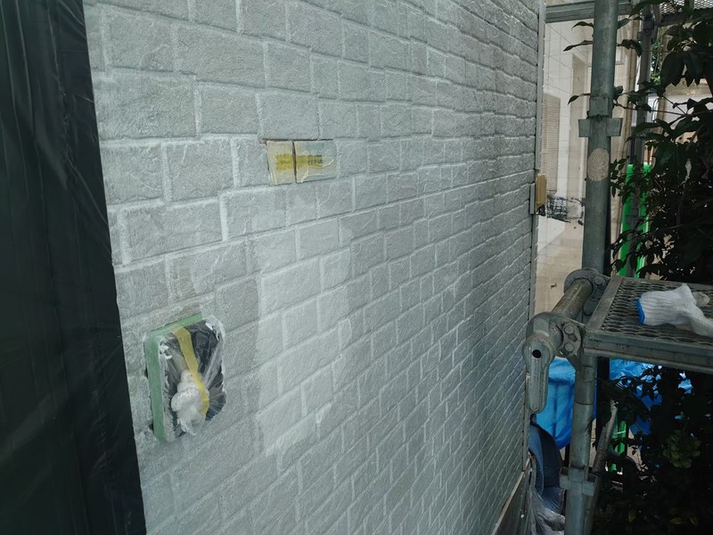 外壁がタイル調になっているため、目地部分など細かなところを丁寧に刷毛・ローラーを使用し塗装していきます。